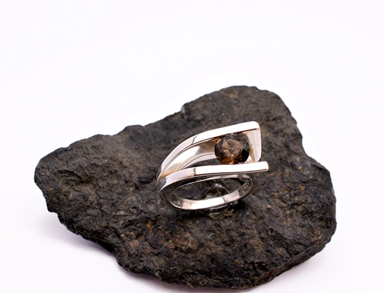 Αυτό το χειροποίητο δαχτυλίδι συνδυάζει τη φυσική ομορφιά του καπνία με ένα μοντέρνο σχέδιο από ασήμι 925. Οι απαλές καμπύλες του μετάλλου αγκαλιάζουν την πέτρα δημιουργώντας ένα κομψό και αρχιτεκτονικό αποτέλεσμα.