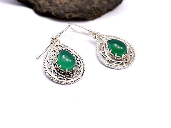 Αυτά τα σκουλαρίκια σε ασήμι 925 αναδεικνύουν την πράσινη ομορφιά του φυσικού όνυχα. Είναι σε σχήμα δάκρυ με φιλιγκράν σχέδια και μπιλίτσες.
